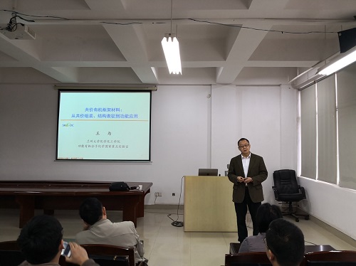 11月8日上午,国家杰出青年科学基金获得者、教育部“长江学者”特聘教授、兰州大学功能有机分子化学国家重点实验室主任王为教授应邀来开云官网进行学术交流。在云塘校区工科三号楼A320会议室,王为教授以“共价有机框架材料:从共价组装、结构表征到功能应用”为题,给大家带来了一场学术盛宴。学术报告会由化学与生物工程学院院长杨荣华教授主持,副院长曹忠教授、副院长朱志平教授、副院长张跃飞教授及化学、化工、食品等相关学科的老师、研究生及本科生100余人参加了学术报告会。