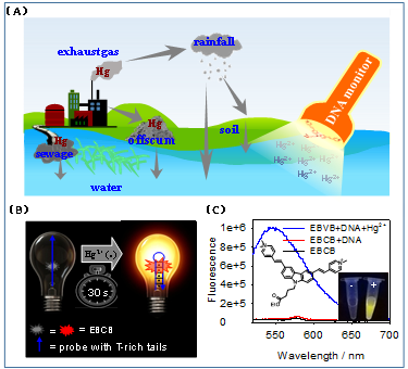 杨荣华教授课题组长期致力于生化传感新原理,及在环境污染、食品安全、生命科学等领域应用的研究。近来,课题组获得一种DNA构型高特异性的咔唑衍生物(ethyl-4-[3,6-bis(1-methyl-4-vinylpyridium iodine)-9H-carbazol -9-yl)] butanoateEBCB),结合汞离子诱导DNA构型转换及荧光信号开关,实现了汞离子的高效光学分析,研究工作发表在《Environmental Science & Technology》上。该方法操作简单、响应快速(30 s)、检测限低(0.82 nM)。通过实际样品分析,证明该技术对环境水样具有很好的检测实用性,望为汞污染的高效监测提供新的手段、为生态保护和人类健康作出贡献。