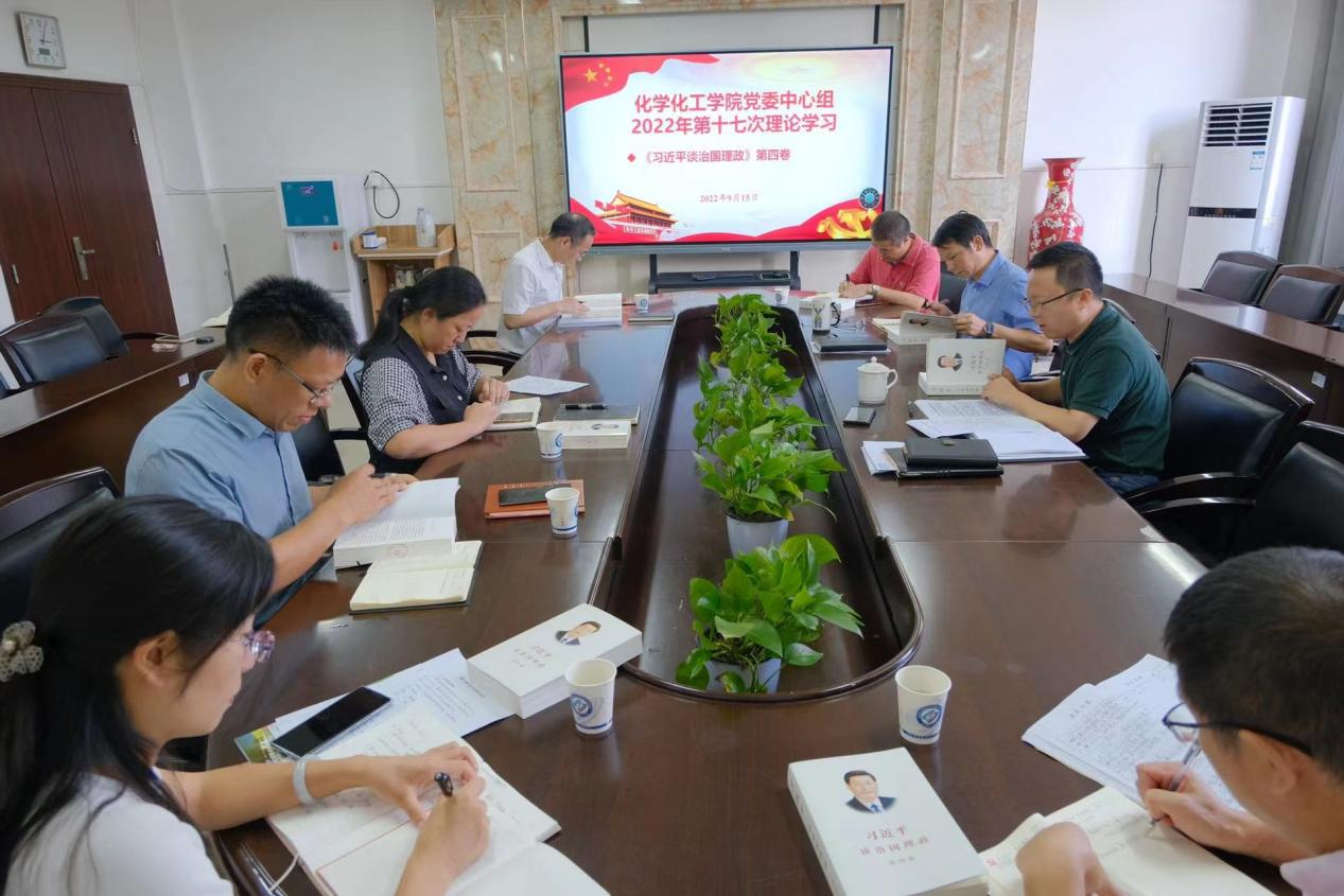 2022年9月15日下午,学院党委理论学习中心组在工科三号楼B318会议室组织集中学习《习近平谈治国理政》第四卷,学习贯彻习近平总书记重要讲话重要文章重要指示批示精神。党委书记宋刘斌主持会议并领学讲话,副院长(主持工作)张跃飞、分析测试中心主任黄永华作专题发言。