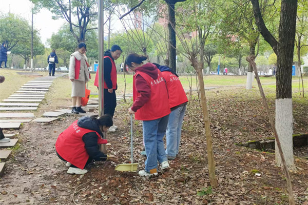 随后,党员们又化身“环境清道夫”,手持垃圾夹与扫帚,沿工科楼至宿舍区的道路展开“地毯式”清理。纸屑藏于草隙,烟头隐在砖缝,党员们仔细清理,不放过任何一个角落。“苔痕阶上本无垢,勤扫方得玉宇清”,春风掠过发梢,汗水浸透衣背,散落的白色垃圾被逐一收入袋中,绿茵道重现明净底色。