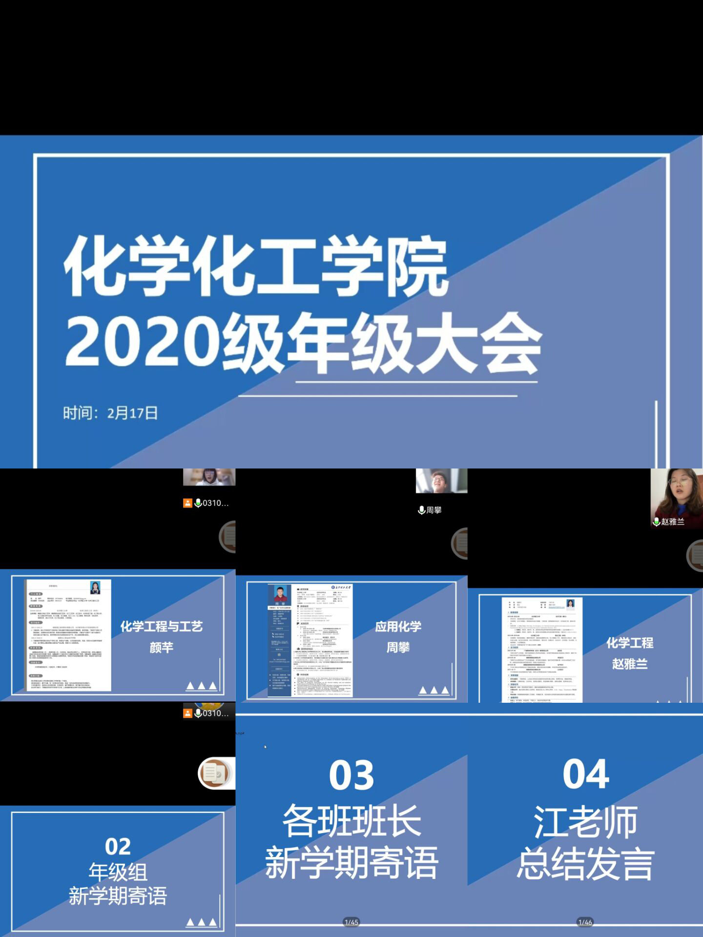 2月17日下午三点,化学化工学院在线上召开2020级新学期第一次年级大会。江洁老师、保研学姐颜芊、研究生学长学姐周攀和赵雅兰以及20级全体学生参加了此次会议。会议由化工类2003班的李帅负责主持。