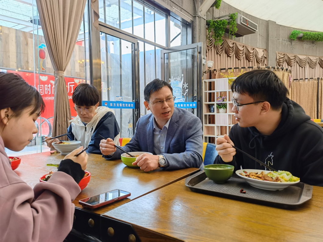 午餐时间,张跃飞与课题组研究生在“汀香园”食堂打好饭菜,绕席而坐,气氛轻松愉快。“我们做科研真正的目的是什么,究竟是为了发好文章,还是能做出一点有用的事情呢?”21级化工专业研究生伍湘提出了自己的疑惑。张跃飞解答:“我们要积极响应国家的号召,把论文写在祖国的大地上,把科学技术转换为生产力,能够为国家和民族的经济发展服务。”他继续解释:“就像咱们课题组,更多的是往应用方面做,将会促进社会生产力的进步;其二,我们还能以更低的成本生产更好的产品,这就是为人类造福;其三,发了好文章固然重要,但若只是为了发文章而发文章,对社会的贡献价值不大,最终也难长远立足。”他举例:“老一辈的科学家并没有因为谋得名利而止步于理论,而是投身于祖国的科技和经济建设,成为国之重器。由此可见,有崇高理想追求,并能以所学化为所用,才是社会真正需要的人才。”