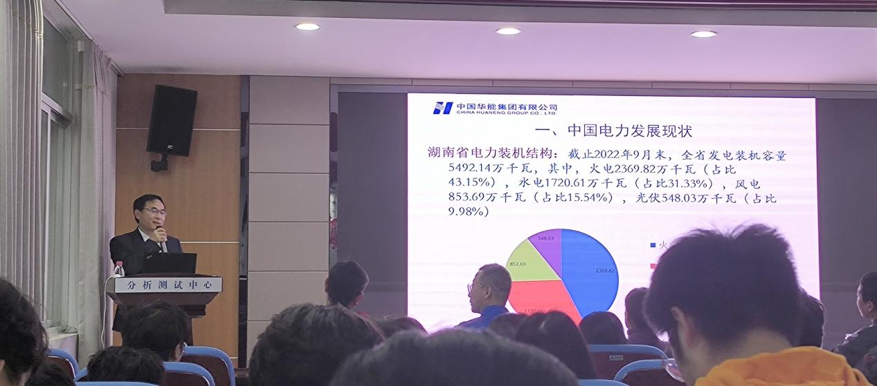 11月22日下午四点二十,化学学院于新能源大楼3B301分析测试中心报告厅举办第二期职业与人生大讲堂活动,本次活动邀请华能集团湖南分公司总经理汪德良进行题为:中国电力化学专业发展历程与未来 的专题讲座。讲座由副院长喻林萍主持,七十余位学生主动参加了此次活动。