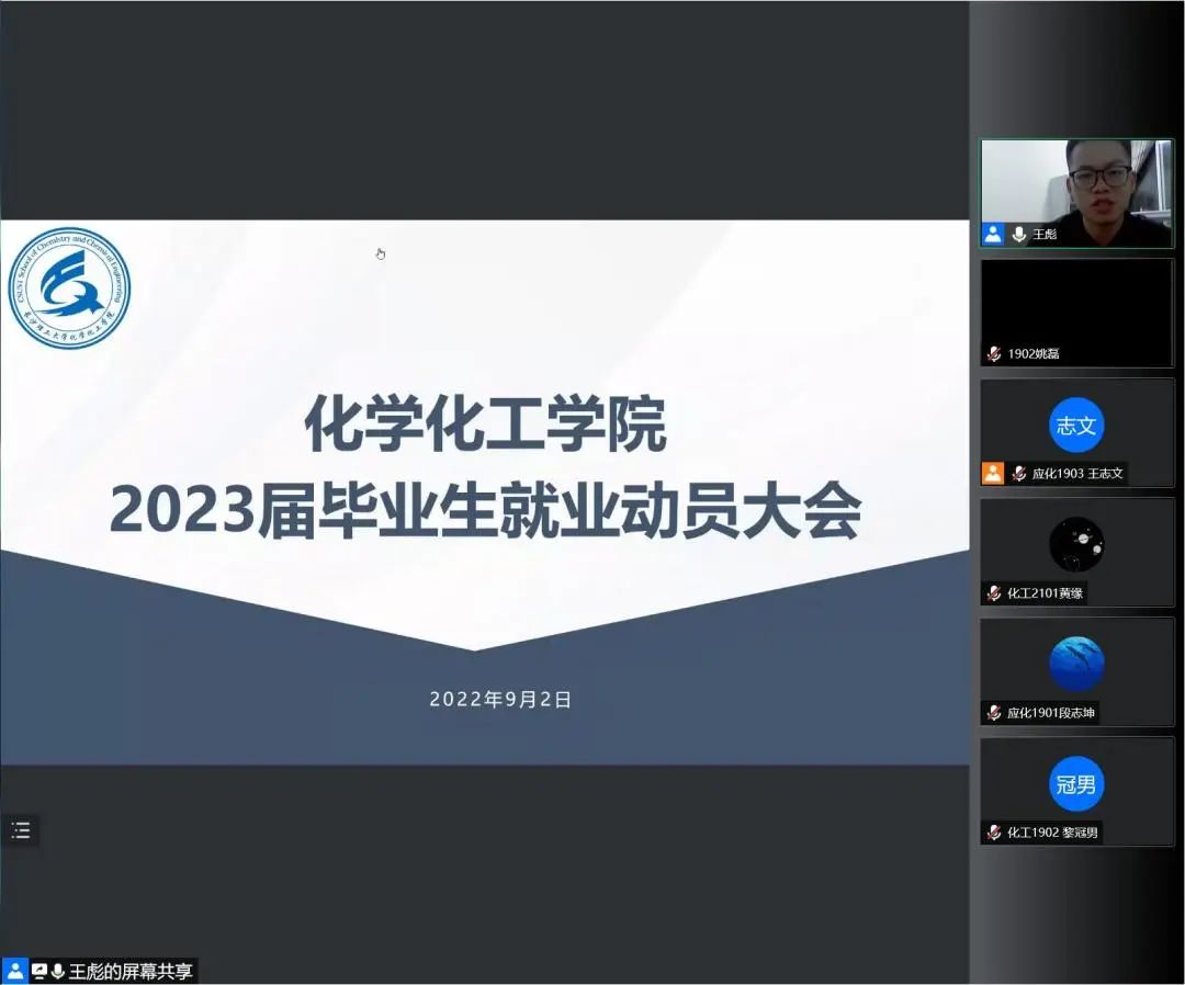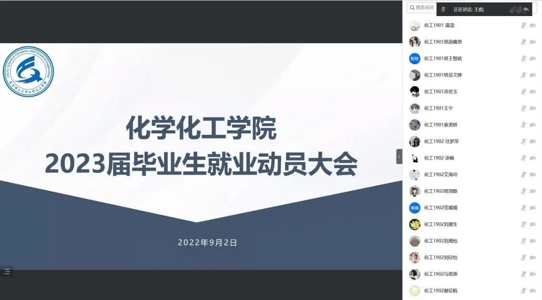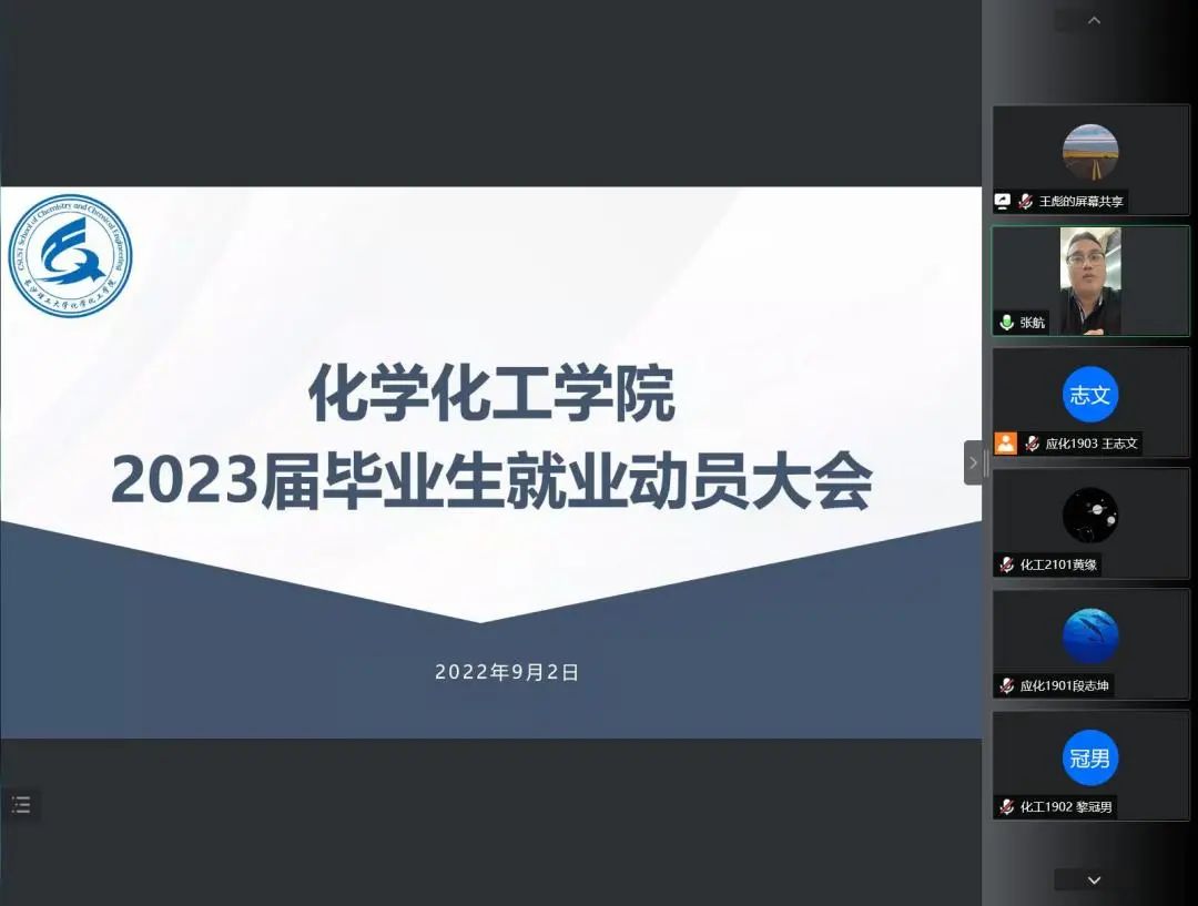 9月2日19:00,开云kaiyun体育化学化工学院2023届毕业生就业动员大会以腾讯会议的形式召开。年级辅导员王彪主持会议,学院党委副书记陶双、就业专干张航出席,2023届毕业生参加。