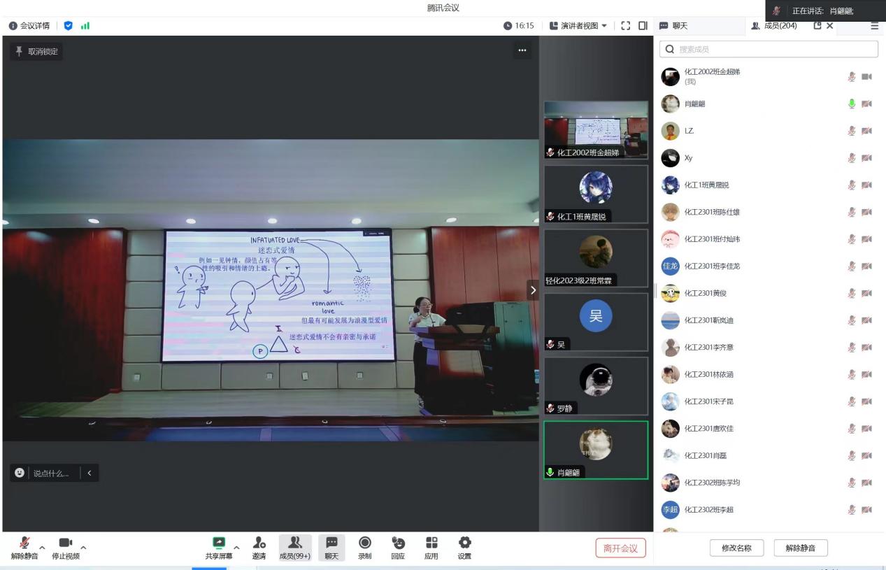 江洁老师从大学生适应与心理健康教育的角度出发,向同学们介绍了心理问题按照严重程度的分类,让大家了解了心理问题的产生原因和特点,希望大家在遇到心理问题时能通过主动学习调节情绪以及向学院心理辅导老师和学校心理中心求助的办法来正确面对,加以解决。接着江洁老师通过向学生提问引出爱情三角形,图文并茂地为大家讲述了爱情三角理论,将抽象的概念变得具体清晰,引导同学们树立正确的婚恋观,辨明恋爱与婚姻之间的不同。同学们积极回答老师提出的问题,在评论区活跃的与老师互动,讲座得到同学们的一致好评。