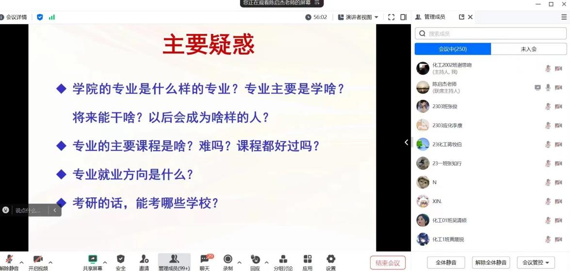 为了使新生更好地了解自己专业的课程设置、课程考试和学分配置的相关情况,帮助新生更好地完成学业。9月20日上午,化学化工学院举行2023级本科新生入学教育之专业学习介绍讲座,讲座采用线上腾讯会议的形式进行,由学院副院长陈启杰主讲,2023级本科生辅导员陈楠和全体本科新生线上参会。