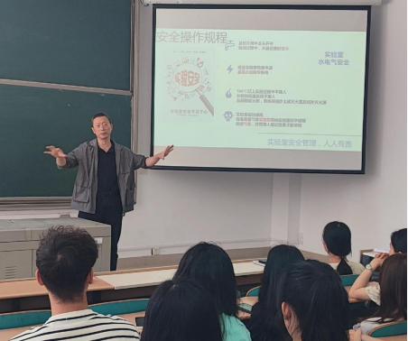 在安全培训会中,曹忠教授详细介绍了实验室守则、安全操作规程以及灭火器的使用方法,并结合实验室安全事故典型案例视频深入浅出地讲解了实验室事故预防措施及应急预案。他强调道,“实验室安全是保障教学科研实验工作顺利进行的基础,也是人身健康的重要保障。”之后22级研究生周菊桃讲解了各仪器的使用操作规范及注意事项;吴玲博士表示使用仪器、危化品前后都要做好登记;李丹老师强调管控药品要实行双人双锁制度;何婧琳博士提出各位同学使用仪器务必经过培训后才能上岗;马天骥博士认为我们在今后工作中应该严格遵守实验室安全规定,确保教学科研实验工作的顺利进行。