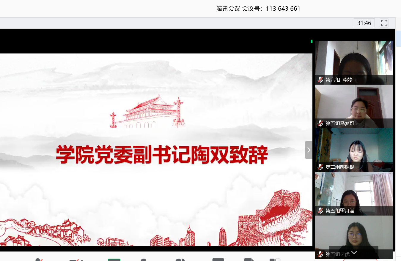4月14日晚18:00,化学学院第十一期发展对象培训班线上开班典礼暨第一次党课在腾讯会议成功开展。化学学院党委副书记陶双、分党校负责人刘文成、外国语学院专职组织员汪功伟老师以及第十一期发展对象全体学员出席。