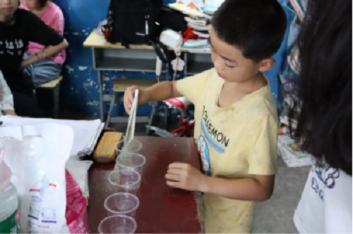 根据排课安排由团队成员李林给孩子们讲解“颜色变变变”实验的基本原理,并演示实验的具体操作步骤。李林先向孩子们介绍实验材料,随后在小助手的帮助下进行实验演示。演示过程中,李林针对实验现象向孩子们提问,孩子们热情回答并积极参与讨论,对杯中试剂颜色的变化表示惊叹不已。演示结束后,团队其他成员给每组分发实验材料,让孩子们通过自己动手操作,切身体会做化学实验的乐趣,领略化学中蕴含的奥秘。