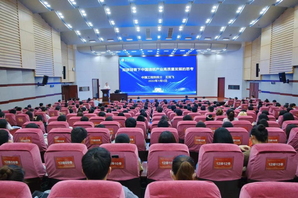 王双飞院士做了题为“双碳背景下中国造纸工业高质量发展的思考”的报告,从双碳背景、中国造纸产业发展现状、双碳背景下造纸工业高质量发展应对及个人成长发展等方面做了深入剖析,展望了中国造纸工业的未来。会场上气氛热烈,与会师生与王院士就学术问题、人才培养等进行了深入交流。