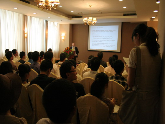 开幕式后进行大会主题报告(Keynote Speech),美国State University of New York at Binghamton(纽约州立大学)钟传建教授、澳大利亚James Cook University(詹姆斯库克大学)何英和教授、开云kaiyun体育/中科院长春应化所曹学强教授、中科院大连化物所孙立贤教授、开云kaiyun体育曹忠教授等五位专家学者分别就绿色能源纳米工程材料与生物医药应用、结构化单分散微胶囊、EB-PVD沉积稀土热障涂层、新型储氢和相变材料、化学/生物传感等领域的最新研究成果做了精彩的大会报告,获得与会代表的热烈掌声。