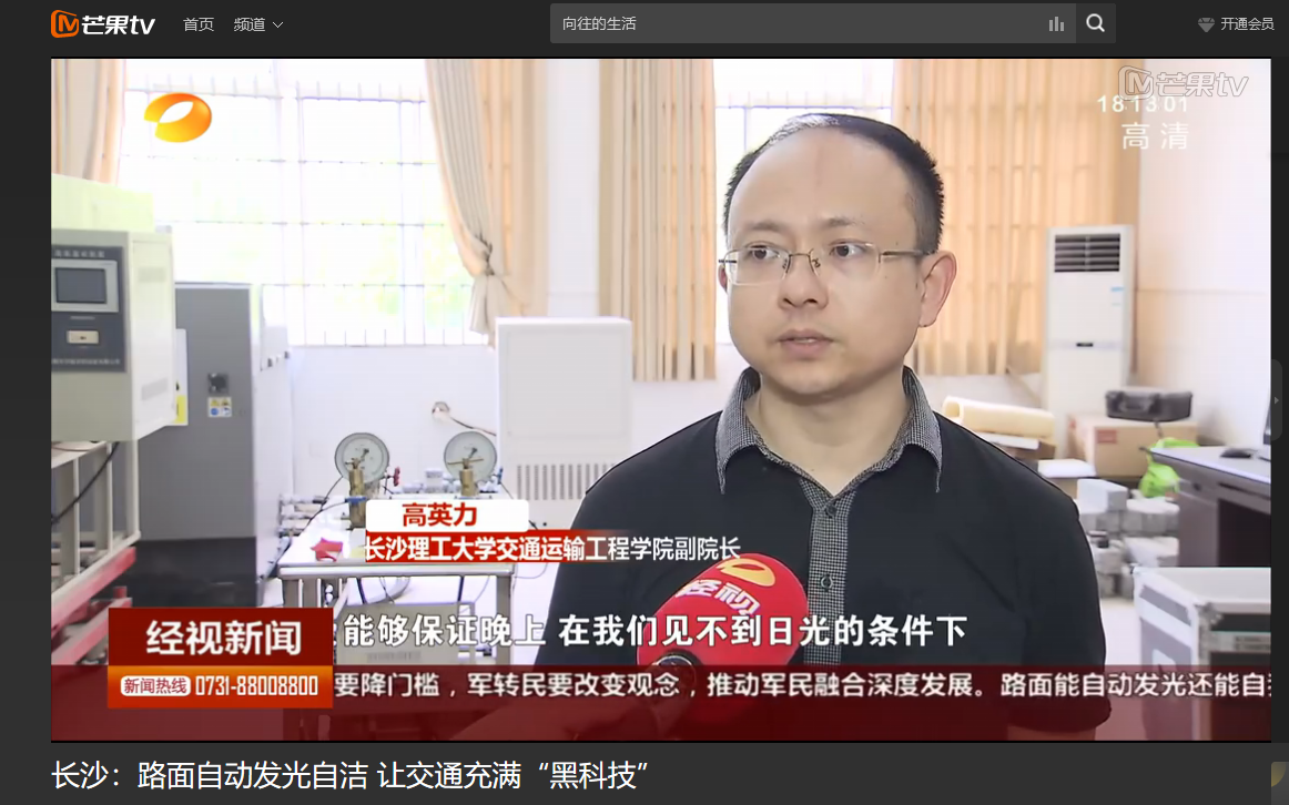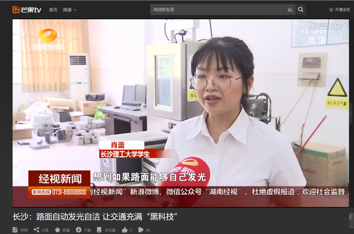 湖南经视5月19日经视联播对开云官网举办的第十三届全国大学生交通科技大赛赛事进行了报道。其中,高英力教授指导,曹韩硕、李欢、袁江、郑策策、肖蕾参与研发的《“自发光—可自洁”智能仿生水泥路面》,受到湖南经视的特别关注进行了跟踪报道。项目从发光标志牌受到启发,运用长余辉发光材料使路面具备自发光的性能,使路面自己发光,对夜间行驶的驾驶员起到警示作用,同时智能仿生水泥运用超疏水材料使路面具备自洁性能和防覆冰效果,有较强的应用价值,最终项目获得第十三届全国大学生交通科技大赛二等奖。