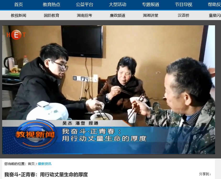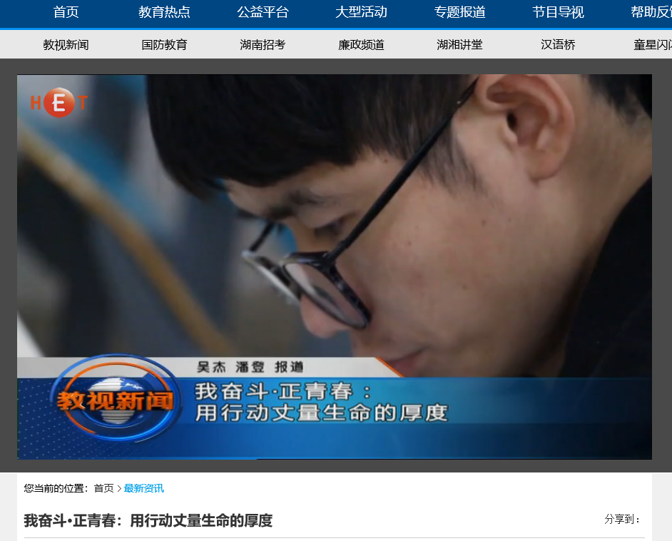 6月11日湖南教育电视台首页最新资讯,以《我奋斗·正青春:用行动丈量生命的厚度》为题对开云官网计算机与通信工程学院15级研究生邹勇松进行了报道。