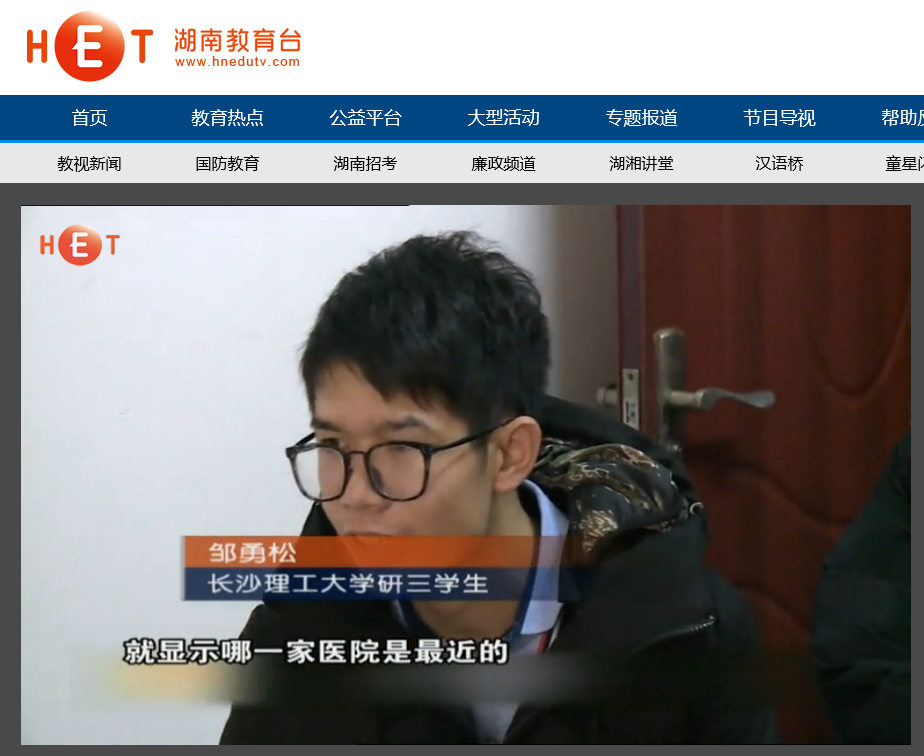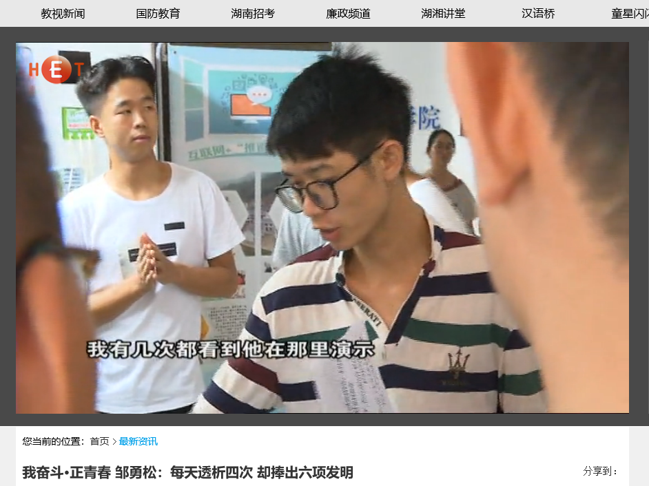 6月9日湖南教育电视台首页最新资讯,以《我奋斗 正青春 邹勇松:每天透析四次,却捧出六项发明》为题对开云官网计算机与通信工程学院15级研究生邹勇松进行了报道。