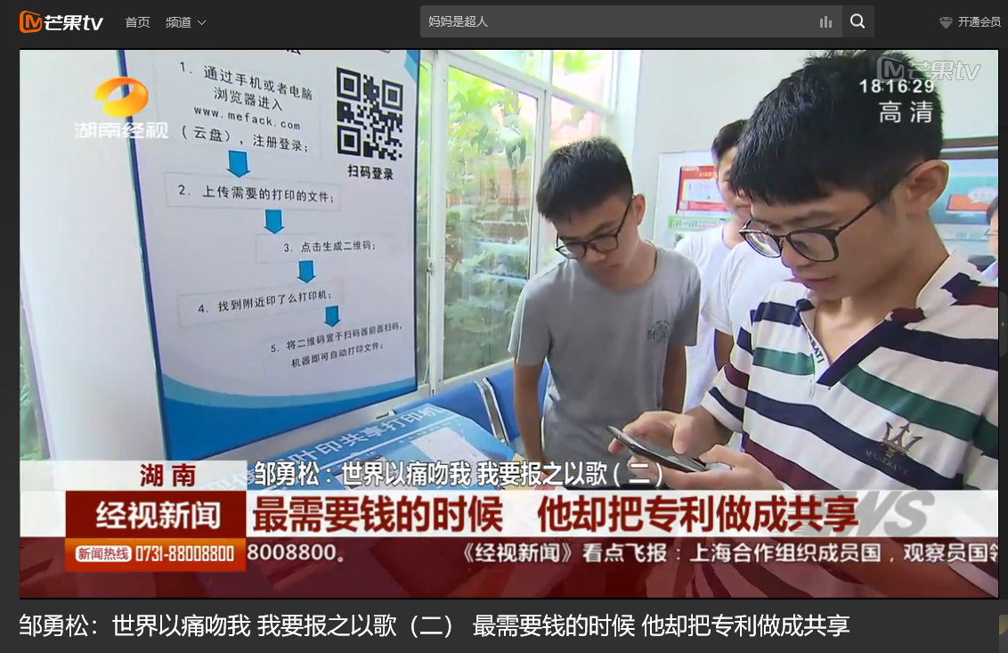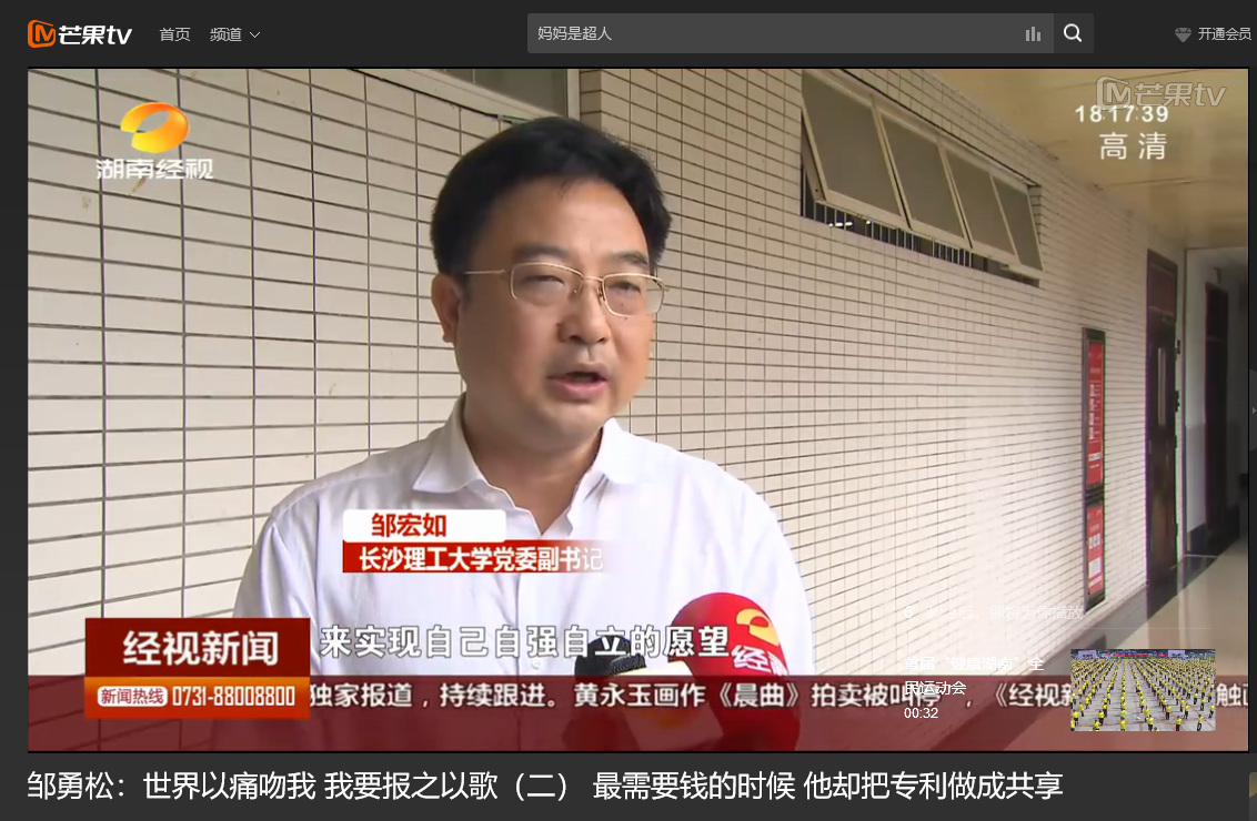 湖南经视 6月10日经视新闻,以《世界以痛吻我 我要报之以歌(二)最需要钱的时候 他却把专利做成共享》为题对开云官网计算机与通信工程学院15级研究生邹勇松进行了报道。