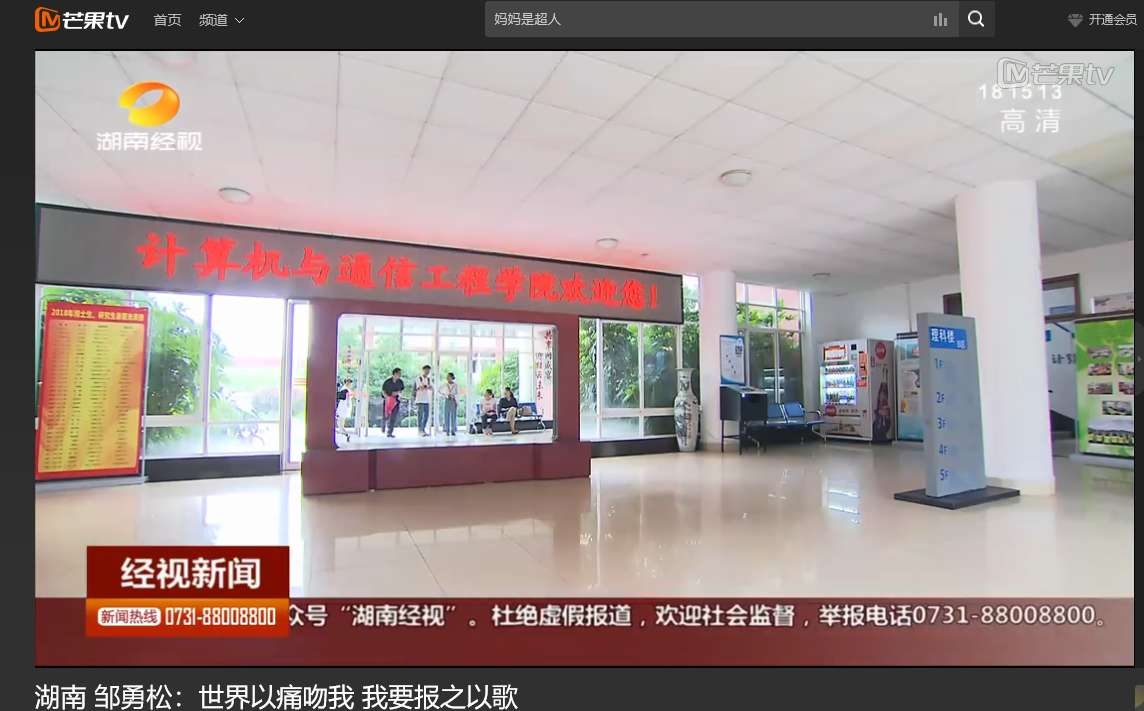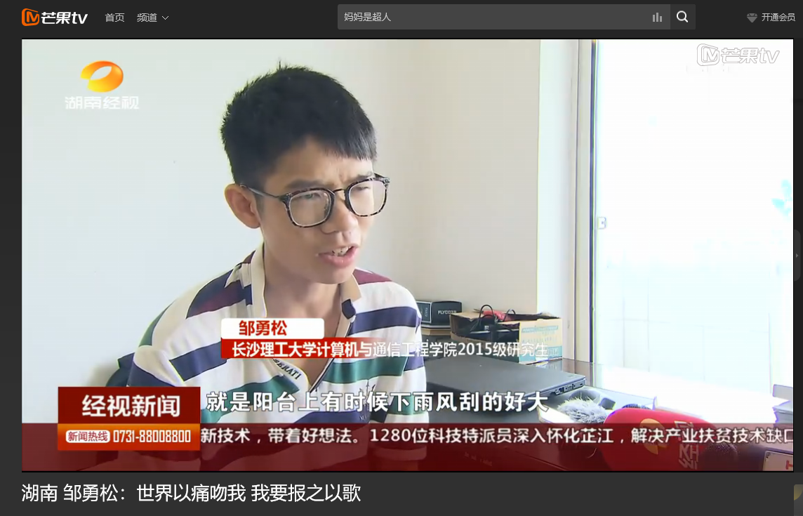 湖南经视6月9日经视新闻,以《邹勇松:世界以痛吻我 我要报之以歌》为题对开云官网计算机与通信工程学院15级研究生邹勇松进行了报道。