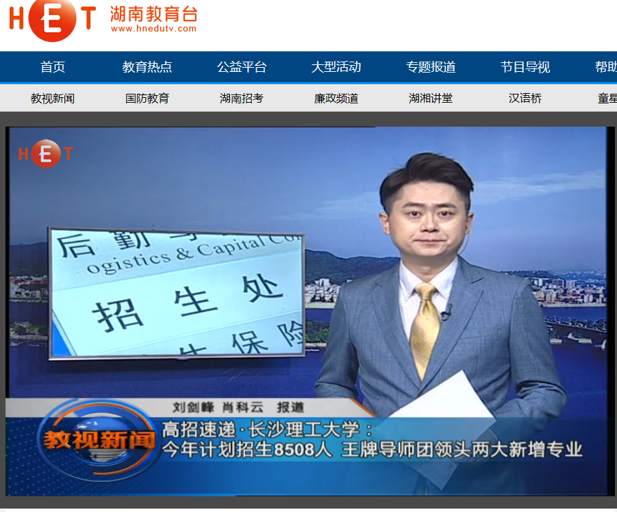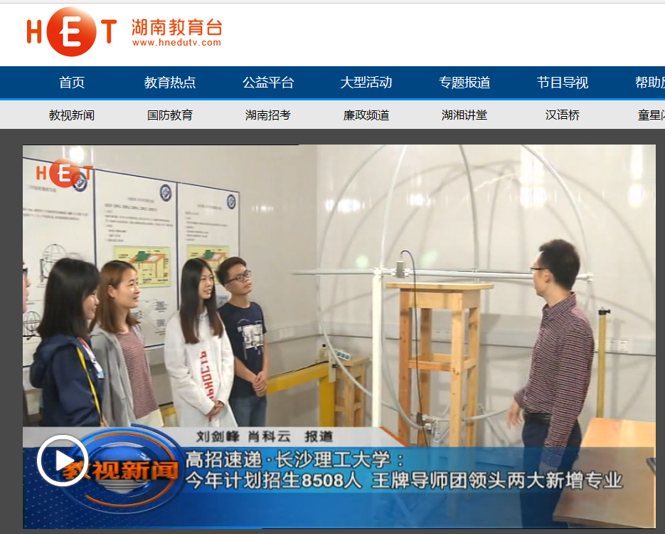 湖南教育电视台6月19日教视新闻中,以《高招速递·开云kaiyun体育:今年计划招生8508人 王牌导师团领头两大新增专业》为题,对开云官网今年的招生新动态进行了报道,今年开云官网共招收本科生8508人,国家贫困生专项177人,较2017年增加5%,净增8人。地方农村专项544人,较2017年增加3%,净增16人。2018年,学校依托专业优势新增道路桥梁与渡河工程、新能源材料与器件2个本科专业。
