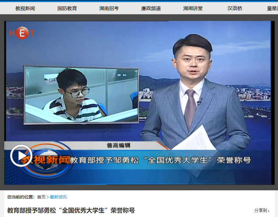 湖南教育电视台7月20日教视新闻中,以《教育部授予邹勇松“全国优秀大学生”荣誉称号》为题对邹勇松进行了跟踪报道。