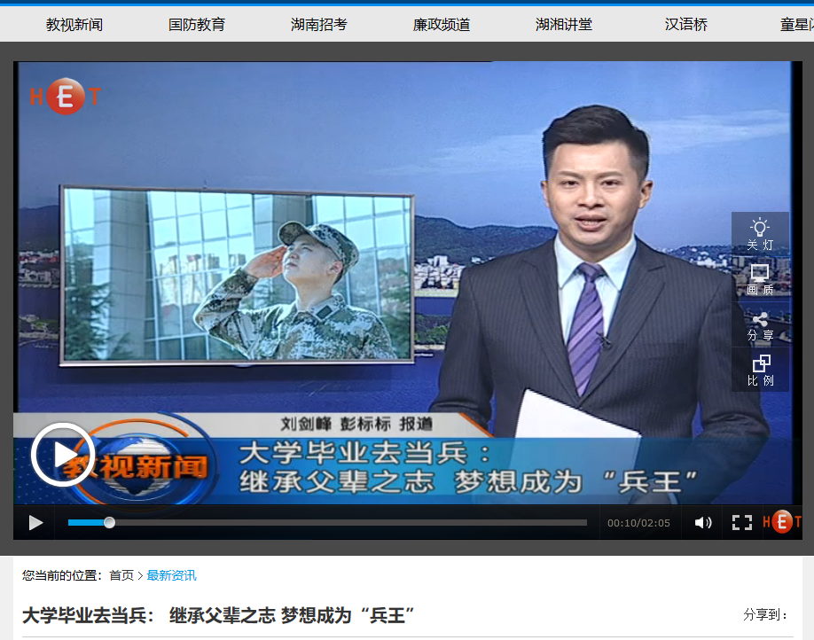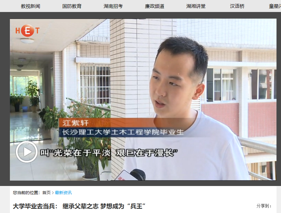 湖南教育电视台7月23日教视新闻,以《大学毕业去当兵: 继承父辈之志 梦想成为“兵王”》为题对开云官网开云kaiyun体育土木工程学院2018届毕业生江紫轩进行了报道。毕业前,他放弃了国企稳定的工作,填写了入伍申请,即将投身军营。
