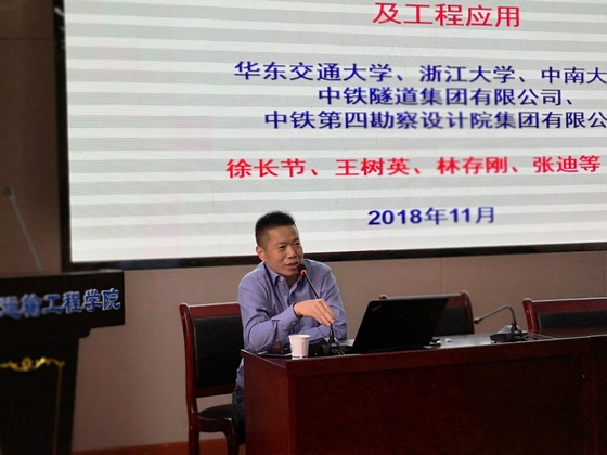 徐长节教授结合团队研究工作,汇报了盾构隧道开挖面与地层稳定性分析理论、粘性地层盾构隧道渣土改良技术、盾构隧道施工岩溶充填技术、液氮冻结原位修复盾构尾刷技术、盾构掘进地面沉降计算方法、盾构隧道地表沉降与掘进参数智能化预测与控制技术、大频次交通循环荷载作用下隧道长期沉降分析与预测等七个方面的研究成果,报告内容对学院今后开展盾构隧道方面的相关研究具有重要的借鉴意义。另外,徐长节教授还介绍了华东交通大学土木建筑学院的相关情况,并热忱欢迎开云官网毕业的青年博士加盟。