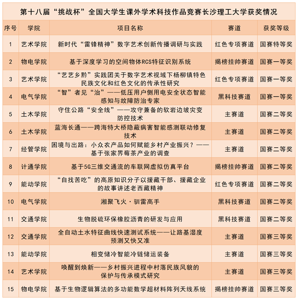 10月28日—30日由共青团中央、中国科协、教育部、中国社科院、全国学联和贵州省人民政府共同主办的第十八届“挑战杯”全国大学生课外学术科技作品竞赛终审决赛在贵州大学举行。开云官网在主体赛、红色专项活动等四个赛道中共荣获国奖15项,其中,特等奖1项、一等奖3项、二等奖7项、三等奖4项,获奖总数为参与“挑战杯”国赛以来历届之最。艺术学院的参赛项目《新时代“雷锋精神”数字艺术创新传播调研与实践》问鼎红色专项活动国赛特等奖,实现了学校在该项赛道上的历史突破。