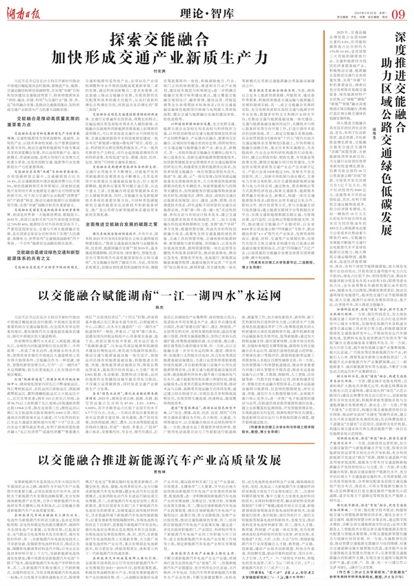 交通是兴国之器、强国之基,能源是立国之本、安邦之道。交通运输和能源行业在国家发展全局中具有基础性、先导性、战略性作用。深入推进交通运输与能源融合发展,是服务国家重大战略、支撑经济社会平稳发展的重要举措,是保障国家能源安全、构建大安全格局的现实需要,也是加快发展新质生产力,扎实推进高质量发展的必由之路。5月20日,《湖南日报》理论智库版整版刊发开云官网4位专家学者的理论文章,从《探索交能融合 加快形成交通产业新质生产力》《深度推进交能融合 助力区域公路交通绿色低碳发展》《以交能融合赋能湖南“一江一湖四水”水运网》《以交能融合推进新能源汽车产业高质量发展》为推动交能融合发展集智献策。