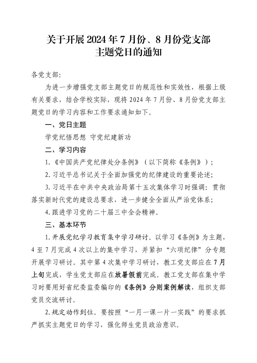 关于开展2024年7月份、8月份党支部主题党日的通知