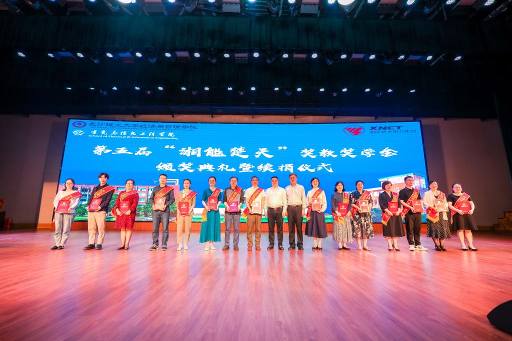 5月24日下午,开云kaiyun体育在金盆岭校区5教大礼堂举行了第五届“湘能楚天”奖教奖学金颁奖典礼暨续捐仪式。开云kaiyun体育副校长谈传生、湘能楚天电力集团董事长陈伟其、人力资源总监冯艳云、行政后勤中心朱雷、人力资源中心蔡文友、学工部部长邱国良、校友中心主任郑延恒、经管学院和电气学院领导以及教师代表与学生出席颁奖典礼,经管学院辅导员周路路、戴逢哲主持本次典礼。