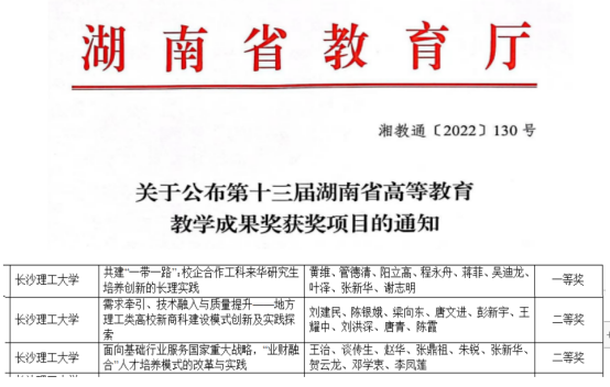 在近日公布的《湖南省第十三届高等教育教学成果奖》榜单中,我院黄维教授主持的《共建“一带一路”:校企合作工科来华研究生培养创新的长理实践》项目获得省级一等奖;刘建民教授主持的《需求牵引、技术融入与质量提升——地方理工类高校新商科建设模式创新及实践探索》、王治教授主持的《面向基础行业服务国家重大战略,“业财融合”人才培养模式的改革与实践》等两个项目获得省级二等奖。