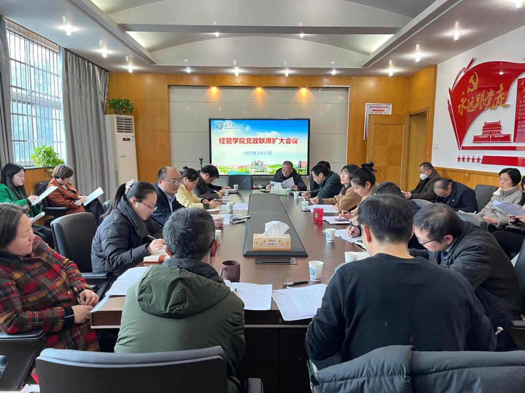 2月21日下午,经管学院在金盆岭校区办公大楼召开党政联席会议(扩大)。会议由学院党委书记丁丹主持,学院领导班子、系(室)主任、教工党支部书记参加。本次会议主题为学习学校2023年工作要点,讨论学院本年度工作要点。