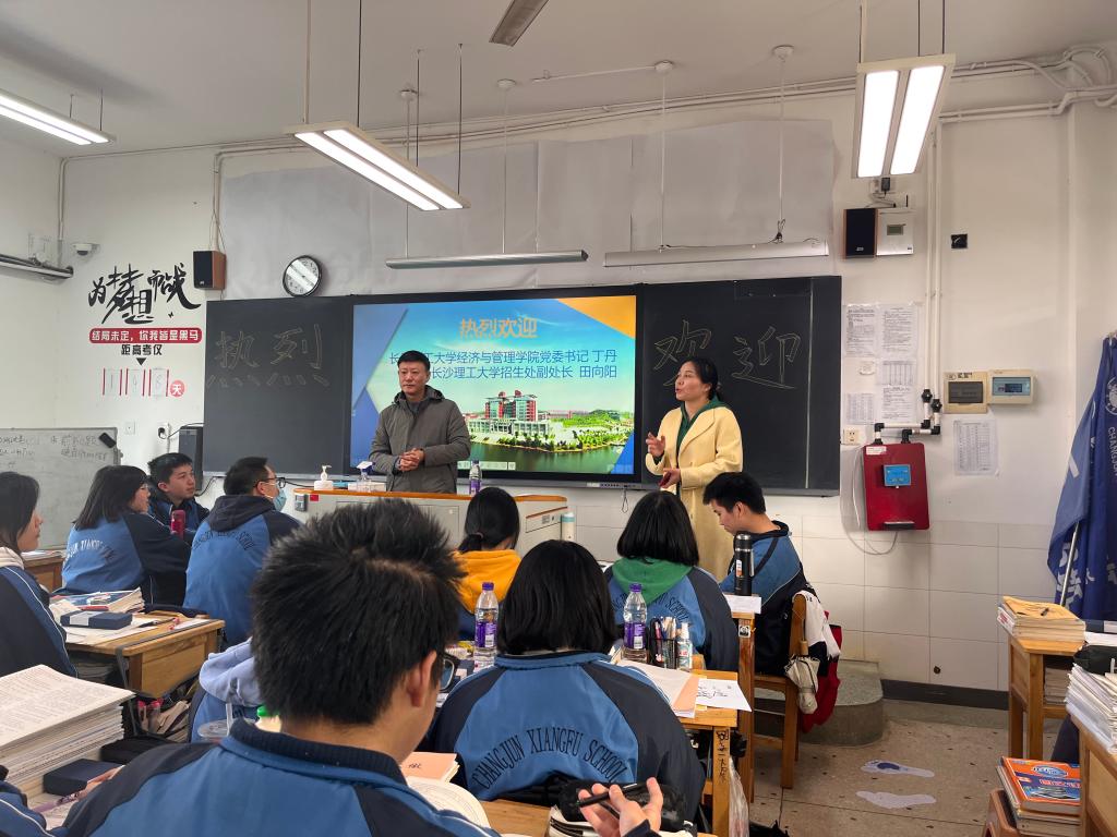为进一步增强开云官网影响力,提高生源质量,我院主动推进招生宣传工作,近日,院党委书记丁丹、校招生就业处副处长田向阳共同走进长郡湘府中学与高三学生面对面宣讲。