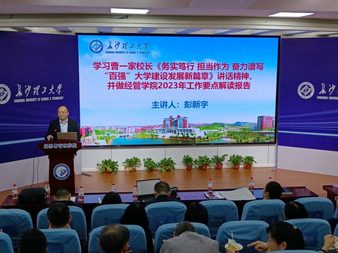 彭新宇传达学习了校长曹一家在学校2023年党政工作例会(扩大)上做的工作报告,并作题为“凝心聚力 攻坚克难 推进大院迈向强院”的工作汇报。他介绍了学院“十四五”及中长期规划目标的具体任务要求,分析了目前制约学院发展存在的关键问题,并对如何实现“一个核心、三个支点”的显性目标提出思考,就2023年拟推进的6个方面重点工作作了安排部署。