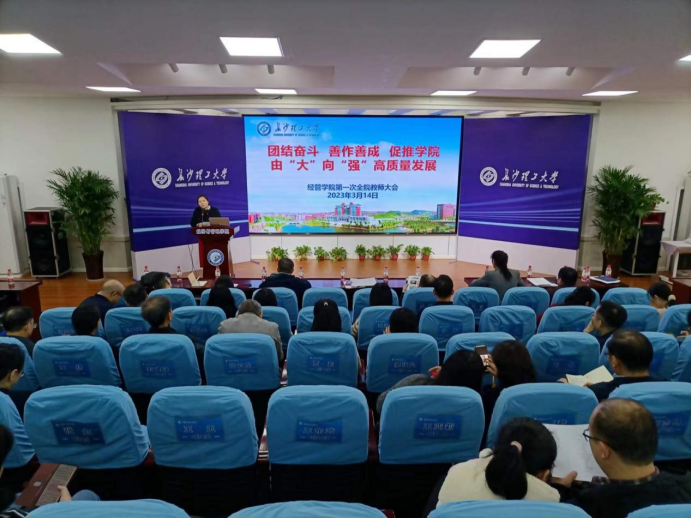 3月14日下午,经管学院在金盆岭校区12教200学术报告厅召开2023春季学期第一次教职工大会,进一步学习贯彻落实学校2023年党政工作例会(扩大)精神,对2023年重点工作进行全面动员部署。学院党政领导班子成员、全体教职工参加会议。会议由学院党委书记丁丹主持。