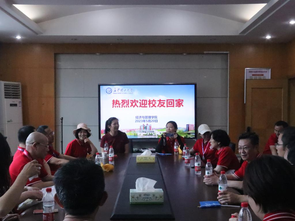 活动结束后,经管校友们前往学院参观,看到学院学生活动场地、素问书屋、教师工作室等地具有完善的教学条件以及先进的教学设备,校友们纷纷点赞。在办公大楼307会议室,师生们召开了一场别开生面的座谈交流会。丁力对各位校友的到来表示热烈的欢迎,介绍了学院的近况,并对大家为学院发展付出的辛勤劳动和卓越贡献表示深深的感谢。校友们依次进行自我介绍,并相互交流了自己几十年的生活、工作情况,表达对母校的感恩,并提出了很多人才培养工作的建议。最后,唐青感谢校友们对母校的关心与支持,介绍了近期学院在筹办的校友活动情况,期待校友们常回母校、共话发展。座谈结束,校友们前往东苑食堂用餐,重温校园生活。在欢快的气氛中,活动圆满落幕。