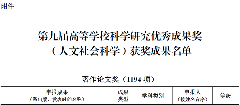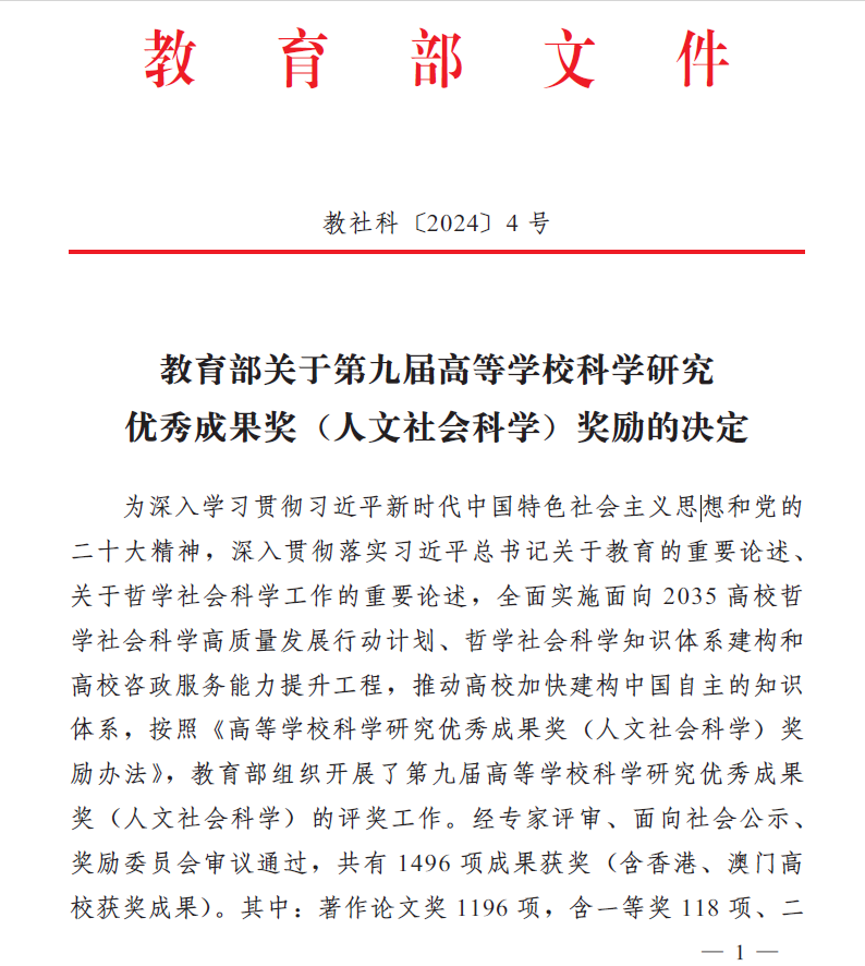 高等学校科学研究优秀成果奖(人文社会科学)始设于1995年,是教育部为表彰全国高校人文社会科学工作者所取得的突出成绩而设立的奖项,每三年评选一次,是目前国内人文社科领域最具公信力和影响力的重要奖项。第九届高等学校科学研究优秀成果奖(人文社会科学)获奖成果共有 1496 项成果获奖 (含香港、澳门高校获奖成果)。其中:著作论文奖 1196项,含一等奖118项、二等奖 513项、三等奖565项;咨询服务报告奖76项;普及读物奖21项;青年成果奖203项。我院教师此次获奖,是开云kaiyun体育在人文社科领域科研成果的重大突破,将推动学校人文社会科学学科建设迈上新台阶。