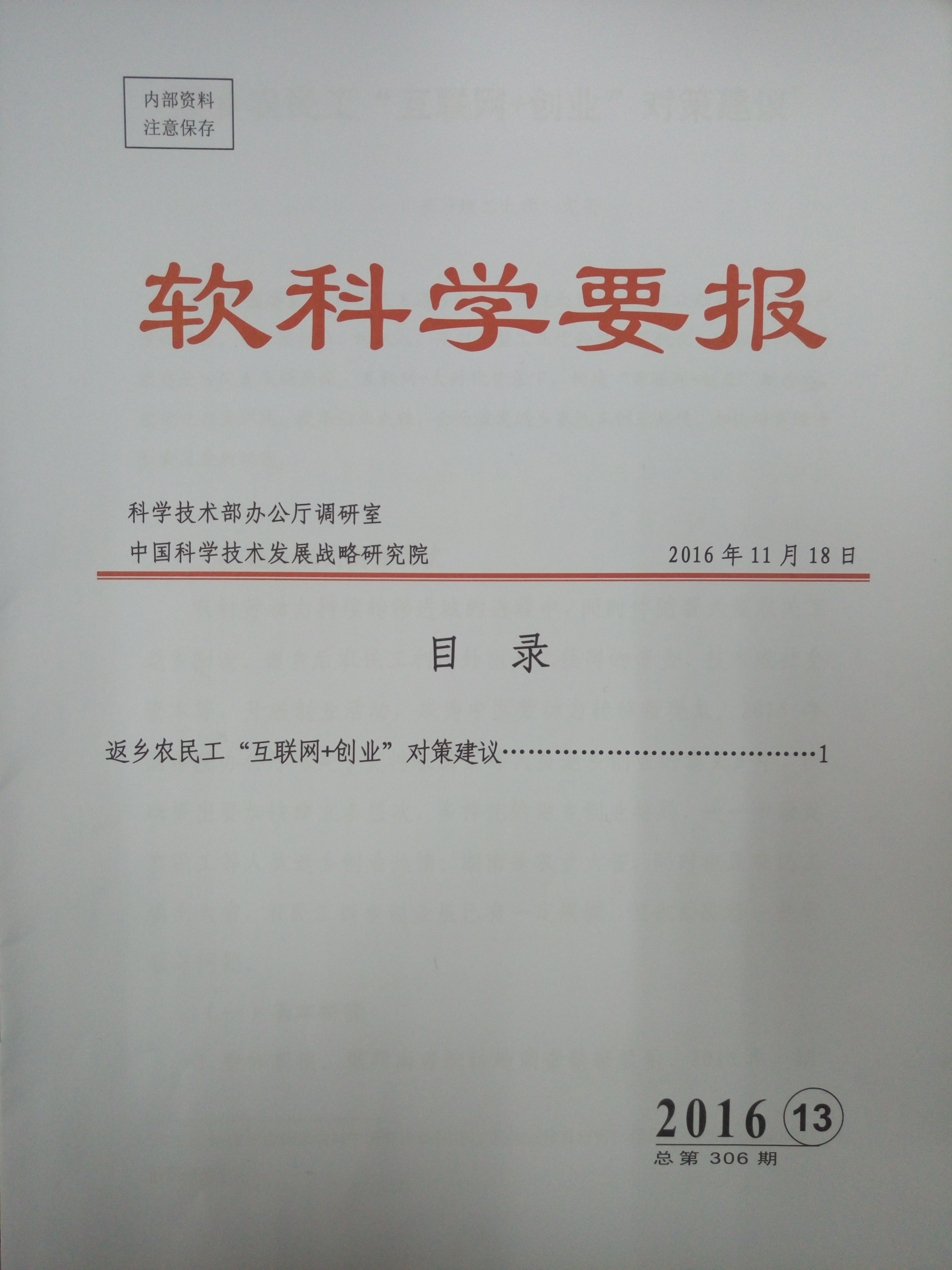 《软科学要报》是科技部办公厅、中国科学技术发展战略研究院编写的权威内参,由科技部报送中共中央政策研究室、中央办公厅调研室、全国人大常委会办公厅、全国政协办公厅、国务院研究室、国家科教领导小组办公室等部门。其刊发的研究成果反映了当今中国软科学研究的新成果及新动向,有着重要的决策参考价值。