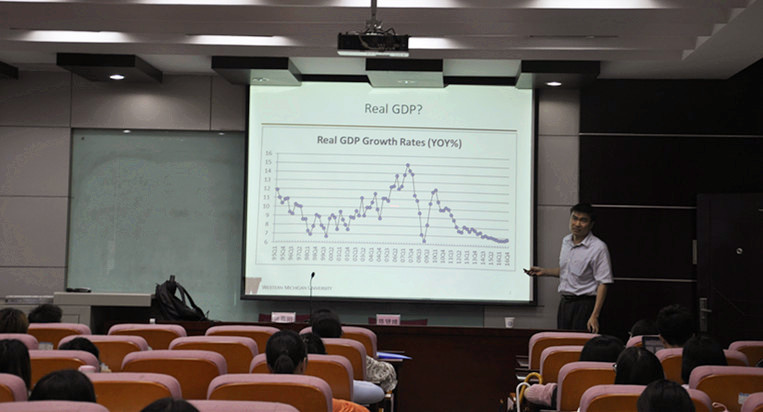 5月31日下午在金盆岭校区7教212,美国西密歇根大学经济学系洪嘉阳教授为我院师生做了题为《Measuring business cycles in China》的专题讲座,2016级、2017级研究生及我院部分教师代表等近百名师生参加了讲座。院长陈银娥教授主持讲座。