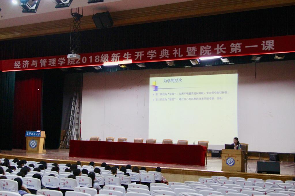 2018年9月12日晚,经管学院研究生“院长第一课”在金盆岭校区五教大礼堂举行。院长陈银娥教授以“博学慎思、勤学笃行”为题给2018级299名研究生上了生动的第一课,本次讲课由学院党委副书记涂道勇主持。