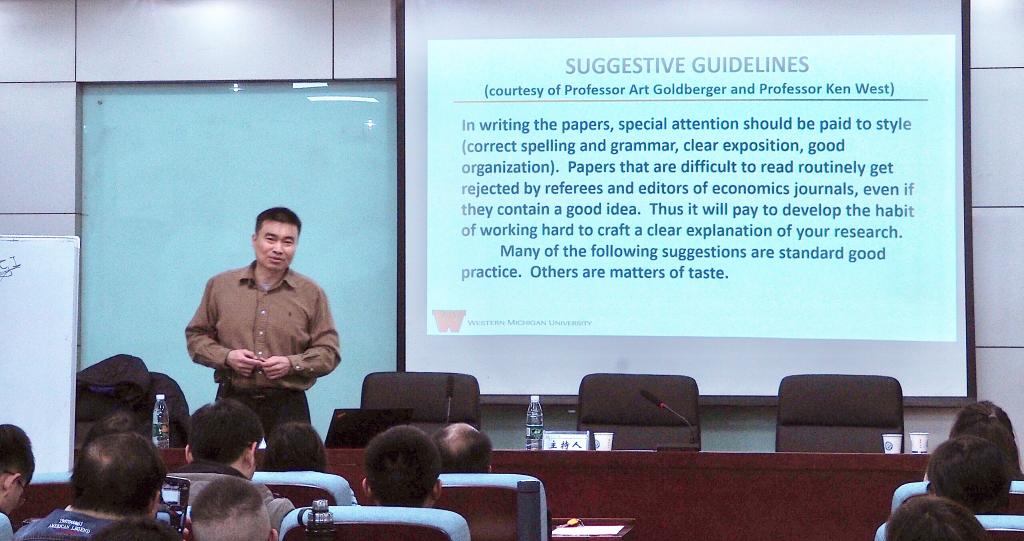 洪嘉阳教授是西密歇根大学经济学系教授,《大西洋经济杂志》编辑委员会成员,中南财经政法大学富布莱特学者和文澜学者。曾为台湾大学人文和社会科学高级研究所富布莱特研究学者、阿拉巴马大学助理教授。主要研究领域包括货币经济学、宏观经济学、金融经济学、应用经济计量学,获得过富布莱特学者、富布莱特研究奖、西密歇根大学提摩西莱特中心中国研究资助奖、西密歇根大学国际教育人员发展基金、西密歇根大学艺术与科学学院教学与研究奖、阿拉巴马大学研究奖、《大西洋经济杂志》最佳文章奖、哈罗德经济学研究生论文奖,科研成果极为丰硕。他此次来我院,是应邀来完成我院2019年研究生“海(境)外优秀学者授课计划”课程《资产定价》的教学任务的。