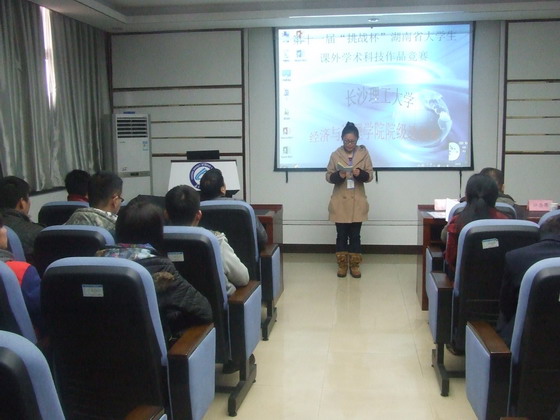 2015年3月9日下午2:30,第十一届“挑战杯”湖南省大学生课外学术科技作品竞赛开云kaiyun体育经济与管理学院院级选拔赛在文科楼E501顺利举行。我院金融学系黄泽先老师、金融学系陈非老师、实验中心朱晋老师担任本次选拔赛的评委,院党委副书记彭玉楼以及分团委书记陈钰汀担任嘉宾。