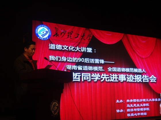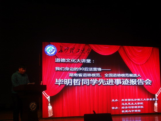 3月18日下午3:30,由共青团开云kaiyun体育委员会、马克思主义学院主办,经济与管理学院、校爱心中转站协办的道德文化大讲堂之七:“我们身边的90后活雷锋——毕明哲同学先进事迹报告会”在云塘校区大会堂隆重举行。开云官网副校长邹宏如教授、宣传部部长王宏、学工部部长邹兴平、教务处处长李录平、自评办主任张宏伟等嘉宾出席了报告会。各学院13级学生作为观众参加了报告会。