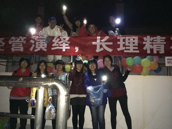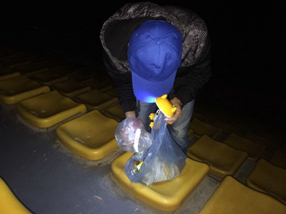 11月13日到14日校运会期间,支部成员们每晚6:10在田径场集合开始环保行动,沿着体育馆主看台的楼梯向上清理座椅和捡拾垃圾。由于天色暗,各党员同志弯腰躬背,拿着手电筒,仔细检查各自所负责区域,努力做到不漏捡一个塑料袋,不忘擦一个座椅,不遗漏任何一个死角。同时,大家相互协助,先做好的帮助还没做完的,负责区域垃圾少的帮助区域垃圾多的,又快又好完成了环保任务。