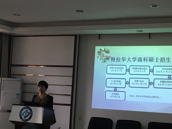 本次讲座由我院年级辅导员李丽兰老师主持。首先,李老师向同学们介绍了程老师的履历、本次讲座的主讲内容。本次讲座主题为“美国top100名校留学申请”,内容主要分为四个部分。第一部分是北美高等教育协会简介;第二部分是美国商科硕士项目概述。程老师从专业硕士与MBA的区别、专业硕士的学制与学分、专业硕士的分类三个方面展开介绍;第三部分是美国金融商科硕士申请须知,包含录取要求、课程要求、专业设置、留学费用等七个方面;第四部分申请美国商科硕士的几点建议。程老师建议同学们要多方位了解学校申请信息,认真对待工作实习,认真修改文书,并且一定要重视面试等。第四部分结合视频,程老师对美国佛罗里达大学以及特拉华大学两所大学的商科硕士录取项目进行了详细介绍。