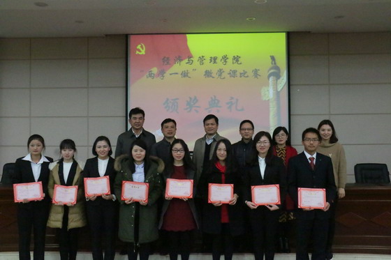 11月29日下午14:30,经济与管理学院“两学一做”微党课比赛于文科楼A200顺利举行。学院党委书记庄创奇、宣传部副部长邱国良、邓崛峰担任评委,学院党委副书记艾楚君、学工办老师、全体学生党员和2015级入党积极分子到场观看比赛。