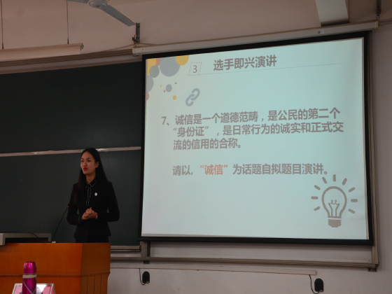 决赛共分两个环节,第一环节命题演讲,选手按照赛前抽签顺序依次进行限时五分钟的主题演讲;第二个环节即兴演讲,现场随机抽取题目进行限时两分钟的演讲。第一位选手围绕“责任与担当” 主题声情并茂的演讲 或激昂高亢、或低沉颂吟,极富有感染力的精彩表现赢得阵阵掌声。随后的选手各显神通,每个人都努力展现自己最出色的一面,他们以其清晰的发音、自然的表达和精准的语言, 展现出了他们从容自信的风采,同时也阐述了自己对“责任与担当”的理解。整个比赛秩序井然,第二环节即兴的演讲过程中更是高潮不断,参赛者随机抽取题目,自由发挥,紧扣话题精心组织材料表达自己的观点。比赛接近尾声,赖某深教授对参赛选手的表现一一做了点评,并指出演讲是一门语言艺术,它的主要形式是“讲”,同时还要辅之以“演”,从而产生一种特殊的艺术魅力,演讲写文最重要的是思想,要有深刻广播的知识做基础。经过最后评定,杜逢清同学等以优异的成绩脱颖而出。