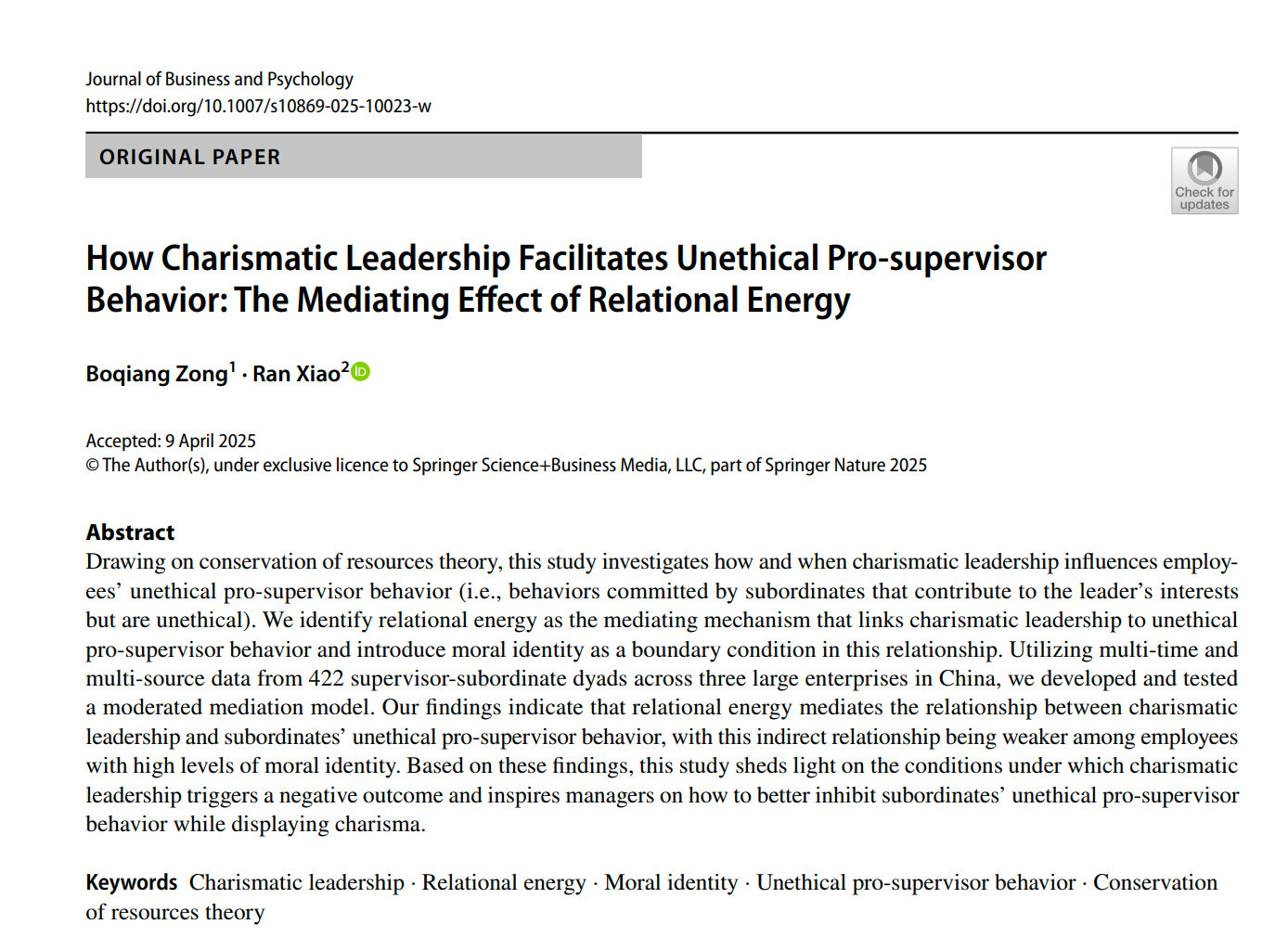 近日,我院教师宗博强博士的论文“How Charismatic Leadership Facilitates Unethical Pro‑supervisor Behavior: The Mediating Effect of Relational Energy”在国际学术期刊《Journal of Business and Psychology》线上刊发,论文第一署名单位为开云kaiyun体育,合作者有中国人民大学博士生肖然。DOI:https://doi.org/10.1007/s10869-025-10023-w。