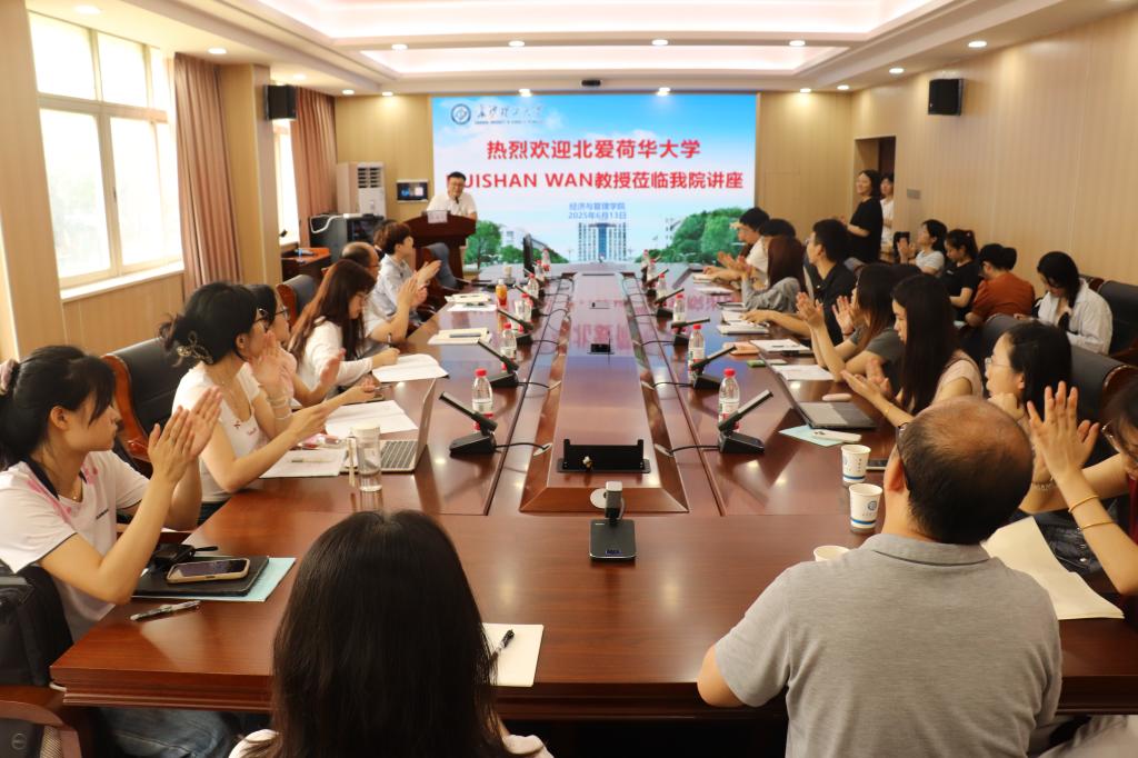 2025年6月13日上午,开云官网财会专业校友、北爱荷华大学(University of Northern Iowa)HUISHAN WAN教授应邀在经管大楼202室主讲金岭学术大讲堂第65期(2025年第19期),主题为“Does ‘Say on Pay’ work? Evidence from Forced CEO Turnover and Compensation Committee Members Turnover”。院长彭新宇,学院青年教师和硕、博研究生共40余人参加了本次讲座。讲座由财务与会计系主任朱锐主持。
