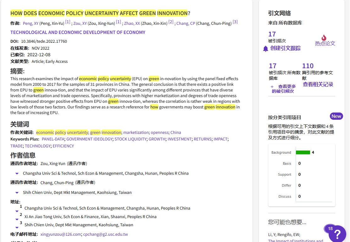 该论文采用2000年至2017年间中国31个省份的面板数据,使用固定效应模型检验了经济政策不确定性(EPU)对绿色创新的影响。总体结论是,EPU 与绿色创新存在正相关关系,并且 EPU的影响在市场化和贸易开放程度不同的省份之间存在显著差异。具体而言,在市场化程度和贸易开放程度较高的省份,EPU对绿色创新的正向影响较强,而在这两个因素水平较低的地区相关性较弱。论文结果为政府如何在政策不确定性增加的情况下促进绿色创新提供了参考。(文/邹幸芸    审/张新华)