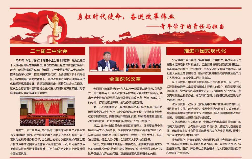 创意笔尖绘就时代新篇,青春视角聚焦改革宏图。同学们通过制作电子小报,进一步深化学习了党的二十届三中全会精神。学生党员化身为会议精神的传播者,对国家发展、时代责任积极回应,纷纷表示要听党话、跟党走,以创新精神筑未来之梦,争做底色亮、能力强、善创新、敢担当的新时代长理好青年。