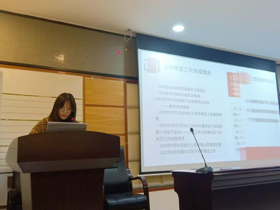 会上,姚依琳对2022-2023学年第一学期下班党员工作进行了总结和评优,对下班党员认真负责的工作态度给予了充分肯定,并公布了优秀下班党员名单。同时,姚依琳还指出下班党员工作存在的问题,并对本学期工作作出规划和展望。随后,赵之润向下班党员介绍了推优工作的相关流程和注意事项,为下班党员日后工作的进一步开展打下了基础。